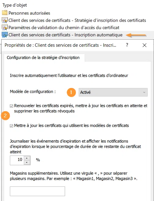 À la rubrique "Clients des services de certificats – Inscription automatique", passez le paramètre à "Activer", puis cochez les deux cases présentées.