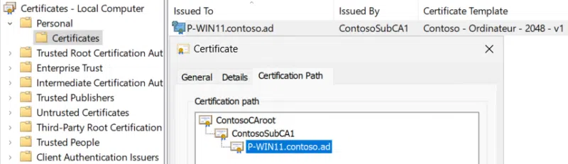 En ouvrant la console de gestion de certificats côté ordinateur via la commande certlm.msc, on constate qu'un certificat issu de l'autorité interne est installé. Ce certificat se situe directement dans le magasin de certificats personnel de la machine. C'est exactement ce que l'on voulait ! Cette opération a été effectuée de façon automatique !