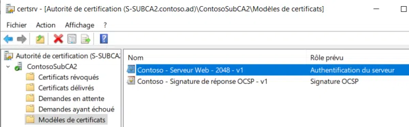certreq -submit -config "S-SUBCA2.contoso.ad\ContosoSubCA2" C:\certificats\certreq.inf C:\certificats\cert.cer