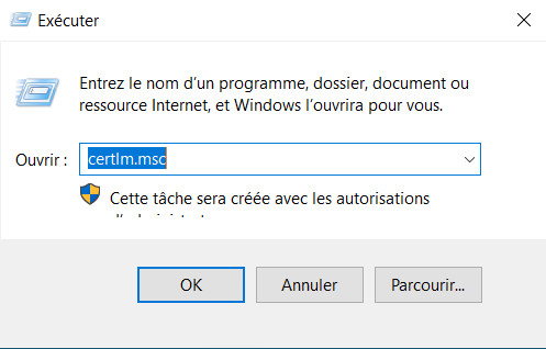 Lancez la commande certlm.msc pour ouvrir la gestion de certificats pour le compte ordinateur. Il convient donc d'ouvrir cette console sur le Web. Ce sera notre point de départ pour les deux prochaines méthodes évoquées (en ligne et CSR).