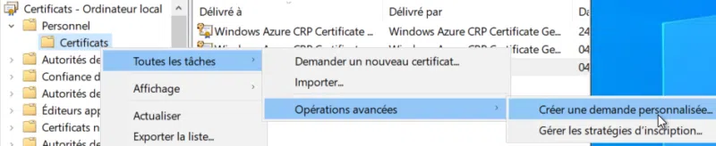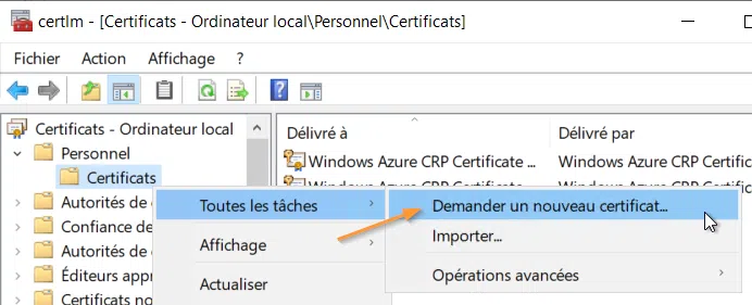 Ici nous allons soumettre la demande directement à l'autorité et obtenir le certificat à la fin de l'assistant. Pour cela, opérez un clic droit sous "Personnel" > "Certificats", puis "Toutes les tâches" et enfin "Demander un nouveau certificat".