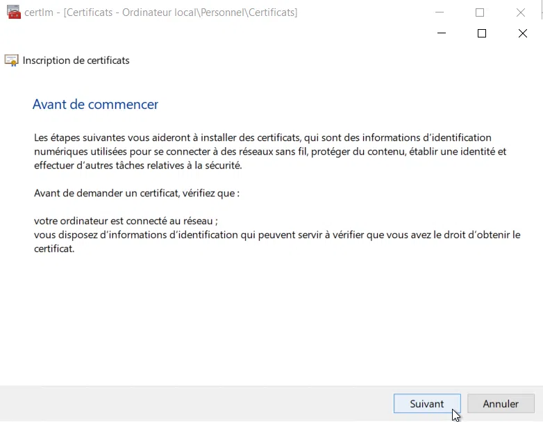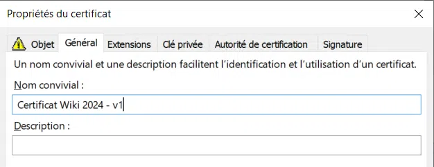 Il est toujours intéressant d'indiquer un nom convivial sur le certificat, cela permettra de dissocier le nouveau certificat des autres pourquoi pas déjà présents sur la machine.