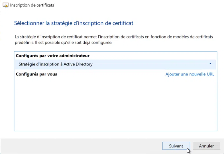 Seule la stratégie d'inscription par défaut est accessible, cliquez sur "Suivant". Pour mémoire, les services CEP et CES permettent à une machine hors domaine d'obtenir un certificat en utilisant le protocole HTTPS. Notre machine étant dans le domaine, la stratégie Active Directory est la plus adaptée.
