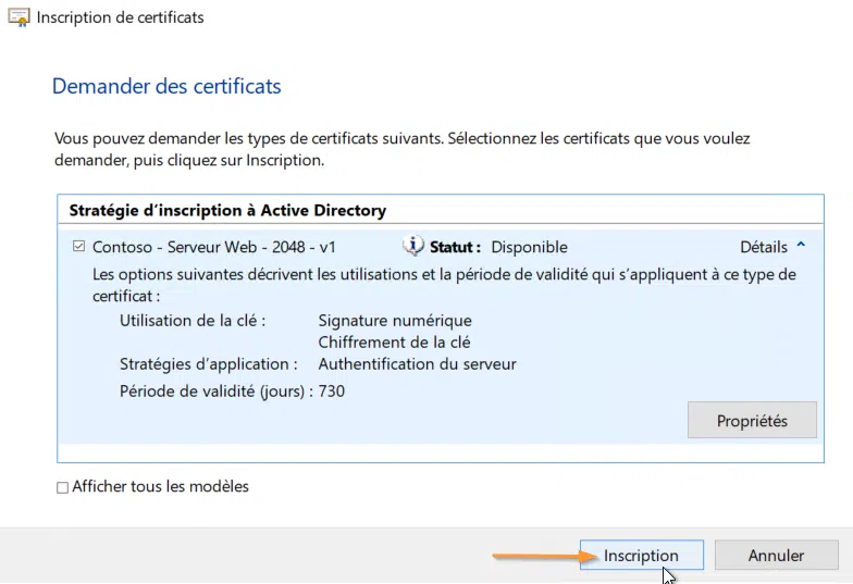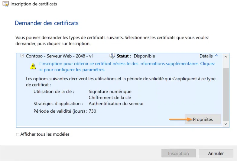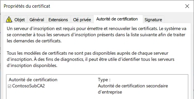 Les autres onglets ne font que reprendre les propriétés du modèle, aussi je ne m'attarderai pas dessus. Notez toutefois, depuis l'onglet Autorité de certification, l'autorité désignée pour émettre le certificat. Si toutefois plusieurs serveurs d'autorités publient le même modèle, en laissant cocher la case devant chaque nom d'autorité, un serveur sera choisi aléatoirement pour traiter la demande.