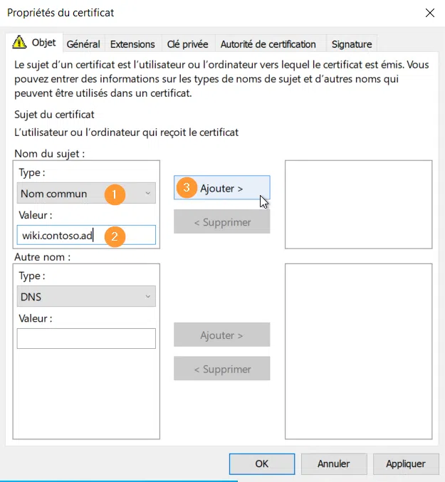 Si d'autres noms d'objets doivent apparaître, il convient de les ajouter à la rubrique "Autre nom" avec un type DNS. Pour un certificat de type SAN, la bonne pratique est toujours de rappeler le nom d'objet principal.