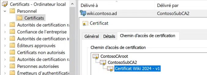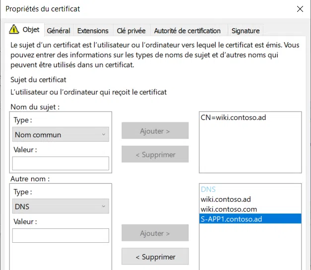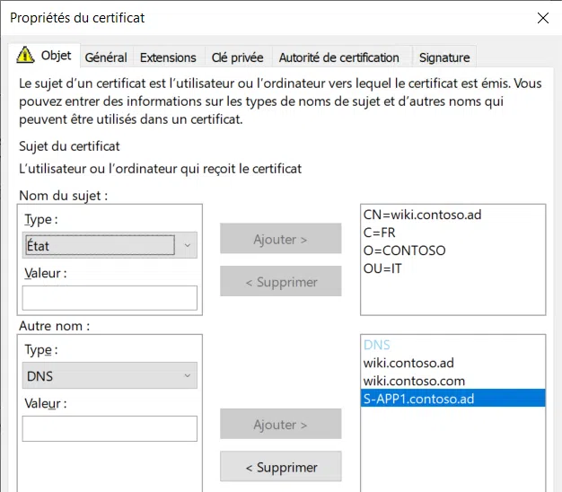 Subject = CN=wiki.contoso.ad, o=Contoso, ou=IT, c=FR