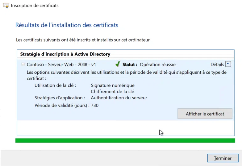 Cliquez sur "Terminer" pour consulter le certificat installé. Notez la présence d'une icône en forme de clé qui indique que la clé privée du certificat est disponible localement.