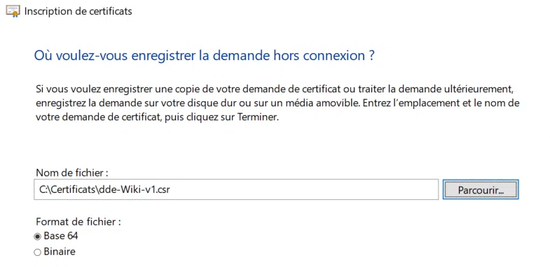 Toujours via MMC, cette variante implique que l'autorité n'est pas directement joignable depuis le serveur où le certificat doit être installé. Il convient alors de générer un fichier de requête, aussi appelé CSR.
