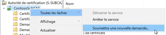 Ensuite, il nous faut copier ce fichier sur une machine qui peut accéder à la console de gestion de l'autorité. Lancez la console de gestion de l'autorité et réalisez un clic droit sur le nom de l'autorité > "Toutes les tâches" > "Soumettre une nouvelle demande".
