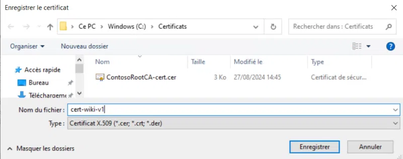 Si vous avez besoin ensuite d'exporter le certificat avec sa clé privée, ce sera possible en utilisant cette fois, une commande PowerShell :