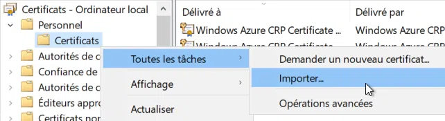 Il ne reste plus qu'à importer le fichier de certificat sur le serveur cible. Ouvrez la console de gestion des certificats via certlm.msc et accédez au menu d'import.