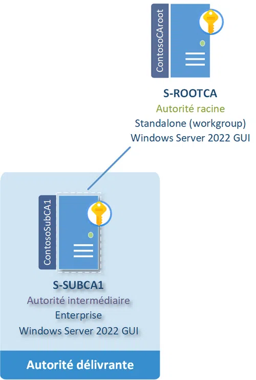 Dans cette architecture, on trouvera un seul serveur jouant le rôle d'autorité délivrante. Il s'agira, habituellement, d'une autorité racine de type Enterprise, pour son intégration à l'Active Directory.