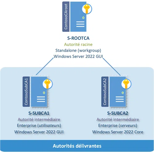 Dans ce contexte, on trouvera un serveur d'autorité racine + une autorité intermédiaire. L'autorité racine est idéalement de type autonome (standalone, et donc en groupe de travail), mais parfois elle peut être de type Enterprise pour des raisons de simplification d'exploitation. Dans les deux cas, on préfèrera qu'elle soit éteinte pour ne pas l'exposer.