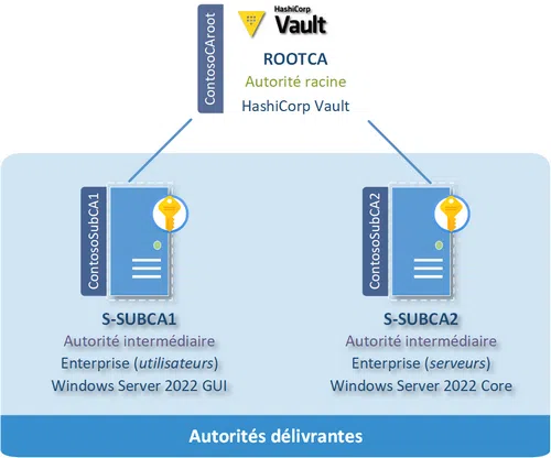Il m'a été donné de voir une autorité racine construite via HashiCorp Vault, elle-même émettrice de deux certificats d'autorités intermédiaires à destination de machines sous Windows Server. Ces dernières étant des autorités de type Enterprise, elles permettent l'accès à l'inscription automatique de certificats (auto-enrollment), grâce à l'intégration dans l'Active Directory.
