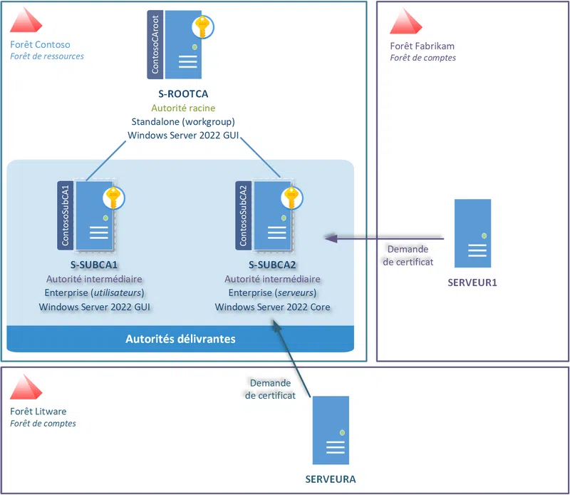 Imaginez un groupe qui dispose de plusieurs entités. Chaque entité possède une forêt Active Directory. Pour éviter de devoir déployer une plateforme de PKI par forêt afin de répondre aux besoins locaux en termes de certificats, on peut opter pour l'installation d'autorités dans une forêt de ressources.