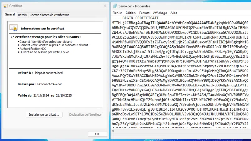 Le format PEM encode les certificats en texte lisible (Base64) et est souvent employé pour transférer des certificats via e-mail ou fichier texte. Il est largement utilisé, car il est compatible avec la plupart des systèmes et facilement lisible par l’Homme. Lorsque l’on édite ce fichier, nous pouvons constater une première ligne telle que « -----BEGIN CERTIFICATE-----» .