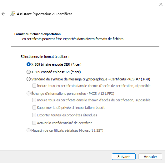 Comme le montre l’image ci-dessous, Windows est capable d’exporter les certificats en plusieurs formats. Il existe également des outils de conversion, tels que OpenSSL.