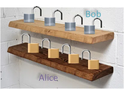 Bob place son carnet dans une mallette, prend un cadenas mis à disposition par Alice et il ferme la mallette avec.