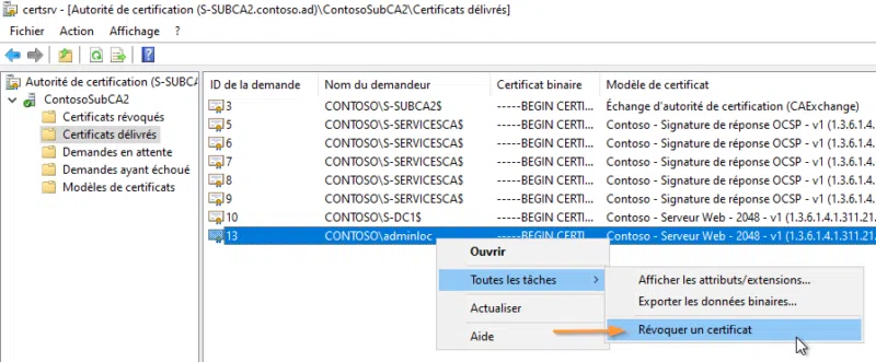 Depuis la "console de gestion d'autorité" pour l'autorité qui contient dans sa base le certificat pour lequel une action de révocation est nécessaire, accédez à "Certificats délivrés" puis dans "Toutes les tâches" > "Révoquer un certificat".