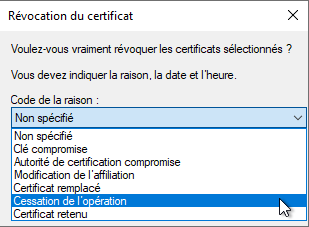 Il vous est alors possible de spécifier une raison justifiant la révocation. Dans la liste déroulante "Code de la raison", faites votre choix. Attention, cette révocation est irréversible, sauf si le motif choisi est "Certificat retenu" (voir la section Annuler la révocation de ce chapitre).