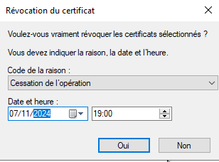 En plus du motif, il vous est possible de définir la date et l'heure auxquelles la révocation sera effective. Si vous laissez par défaut, la révocation sera immédiate.