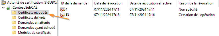 Le certificat passe alors dans la vue "Certificats révoqués".
