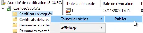 Toutefois, il faut attendre la publication de la CRL pour s'assurer que la révocation soit réellement effective. Si vous ne souhaitez pas patienter jusqu'au prochain intervalle de publication, vous pouvez forcer sa publication. Accédez pour cela au menu "Toutes les tâches" > "Publier", en opérant un clic-droit sur "Certificats révoqués".
