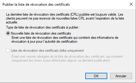 Une nouvelle fenêtre apparaît alors. Il vous suffira de cliquer sur "OK" pour déclencher la publication vers les emplacements désignés comme points de distribution de la CRL.