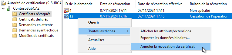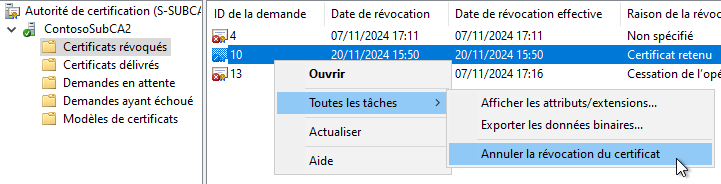 Logique. À présent, si je tente la même opération avec un certificat révoqué dont le code de raison est "Certificat retenu", tout fonctionne. Le certificat sort de la liste de révocation et il repasse dans "Certificats délivrés". Il y a donc une réelle incidence sur la faisabilité de cette action en fonction du code de raison retenu.