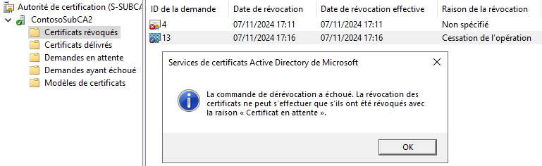 Si je tente d'annuler la révocation d'un certificat pour lequel le code de raison est autre chose que "Certificat retenu", j'obtiens un code d'erreur : "La commande de dérévocation a échouée..." précise ce message.