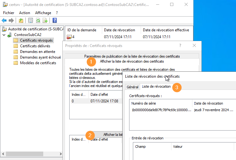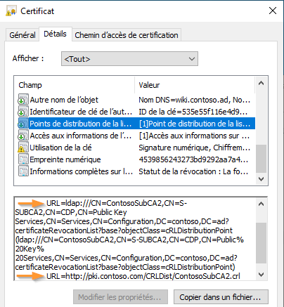 La vérification de révocation par un client utilise le ou les points de distribution fixés lors de l'émission du certificat. Il peut s'agir d'une URL qui pointe vers un fichier .crl ou le service OCSP, ou encore un chemin LDAP. En ouvrant les détails d'un certificat, on peut l'observer dans l'onglet "Détails".