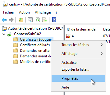 Pour afficher la liste de révocation de l'autorité, depuis la "console de gestion de l'autorité", accédez à la rubrique "Certificats révoqués". Faites un "clic-droit" > "Propriétés".