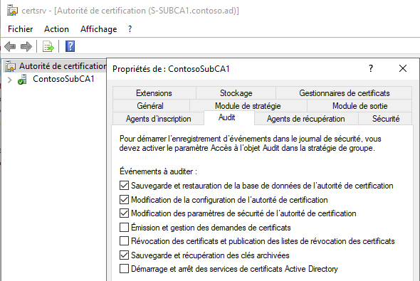 La fonctionnalité d'audit intégrée au service AD CS permet d'enregistrer les activités d'exploitation de l'autorité. Depuis la console "Autorité de certification", en accédant aux "Propriétés" de l'autorité, vous verrez un onglet "Audit". Je vous recommande d'activer à minima les événements illustrés dans la capture.