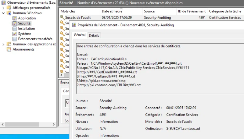 Par exemple, si j’ajoute une URL dans l’extension AIA de l’autorité, je modifie sa configuration et un événement est ajouté dans le journal Sécurité :