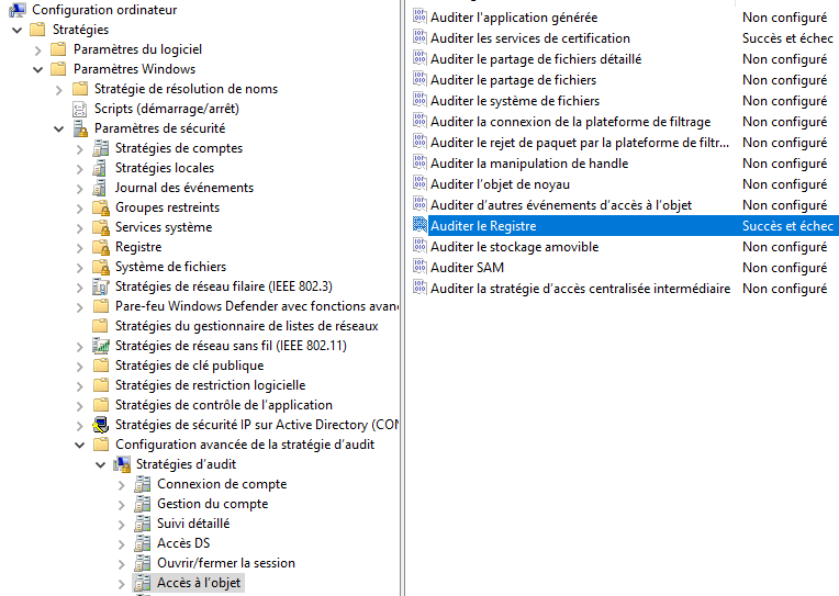 Si on veut aller plus loin, il nous faut également vérifier les changements apportés via les entrées de registres. En effet, toute modification de paramétrages ne passe pas obligatoirement par la console de gestion de l'autorité.