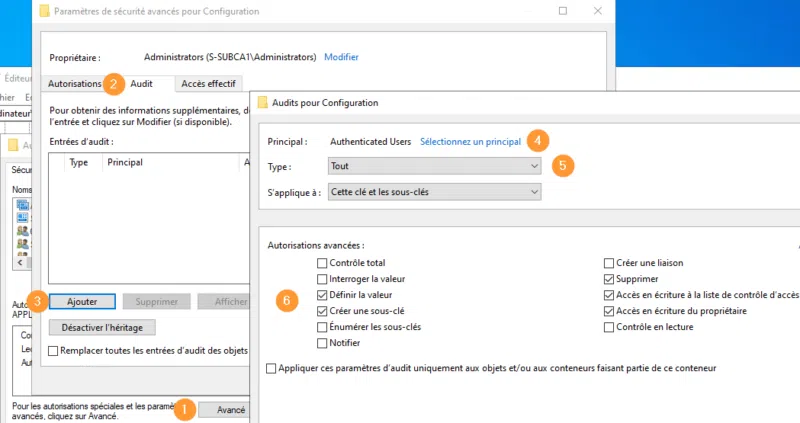 Pour les deux types d'autorité, il nous faut ajouter directement depuis regedit, l'audit sur les entrées de registres AD CS sous :