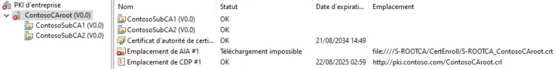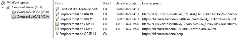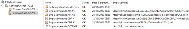 On observe que pour les deux autorités intermédiaires, le statut est OK partout. Cela signifie qu'à la fois le certificat d'autorité, le point de distribution des infos sur l'autorité (AIA) et les emplacements de vérification de révocation (CDP et OCSP) sont accessibles.
