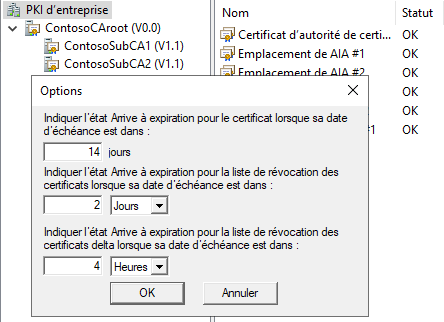Astuce en passant, si la date d'expiration de la liste de révocation est proche, le statut passera en avertissement. Selon l'échéance que vous avez fixée, il peut être préférable de modifier les options de la console pour éviter un avertissement alors que la date est lointaine.