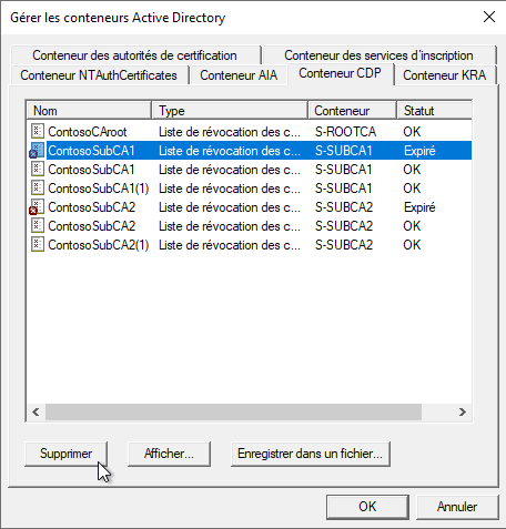Vous verrez apparaître ici toutes les informations que l'on retrouve également dans la console « Sites et Services Active Directory » sous « Services\Public Key Services ». Si une ancienne liste de révocation est présente, il est très simple de la supprimer. Je m'aperçois souvent au travers de cet écran que d'anciennes autorités sont toujours présentes dans l'AD, car mal décommissionnées.