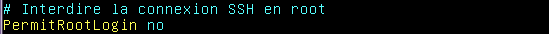 Il peut être utile et pertinent de désactiver l’accès en SSH pour l’utilisateur root. Cela empêcherait le fait qu’on puisse tenter des attaques de type "brute-force" (tentatives d’essais de plusieurs milliers ou millions de mots de passe) avec le login "root". On passe pour cela par le fichier de configuration SSH qui se situe dans "/etc/ssh/sshd_config", on ira y trouver cette option pour lui mettre la variable "no" :