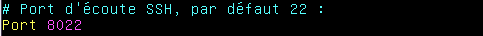 Il est important de savoir qu’il ne faut pas mettre un port en dessous 1024 car les ports 0-1024 sont réservés. On a donc le choix entre un numéro de port entre 1025 et ~65000. Nous choisirons par exemple ici 8022. On doit donc à nouveau aller modifier notre fichier de configuration pour y modifier ce paramètre :