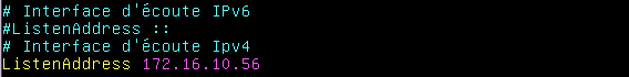 Si votre serveur dispose de plusieurs interfaces, dont certaines sur des réseaux dangereux (DMZ ou autre…), il peut être intéressant de n’écouter et permettre les connexions SSH que depuis le réseaux de confiance (LAN). Cela passe par l’option "ListenAddress" :