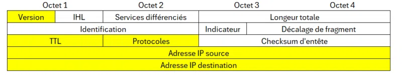 - Version : c'est un champ de 4 bits qui indique quelle version d'IP est contenue dans le paquet. La valeur est 04 pour IPv4 et 06 pour IPv6