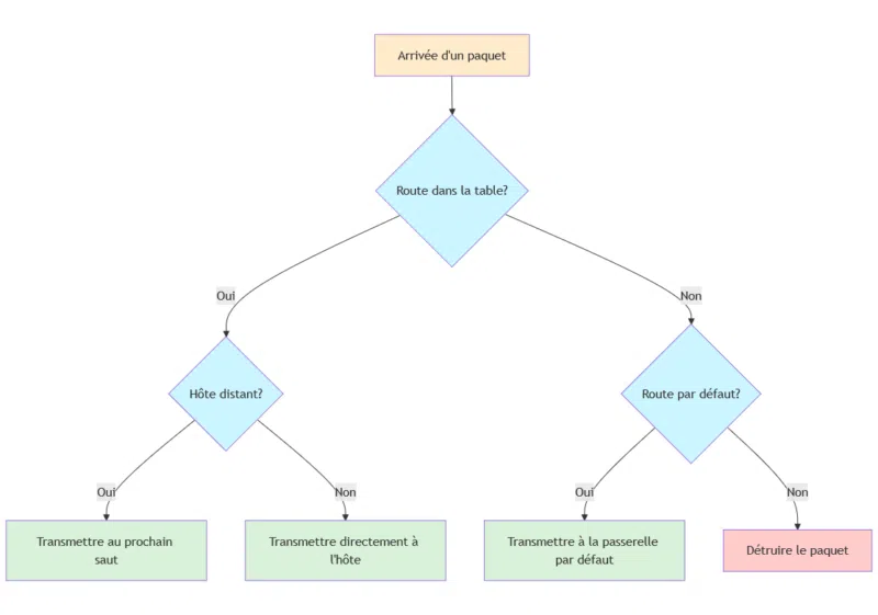 - Si aucune route n'est indiquée, prendre la route par défaut et envoyer le paquet à la passerelle par défaut