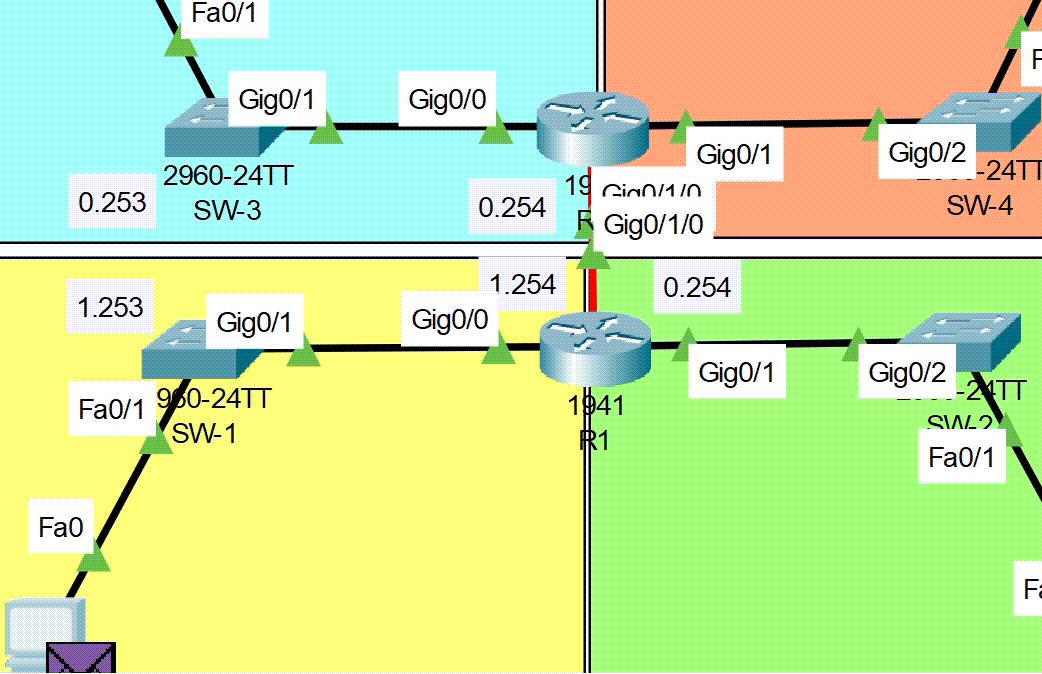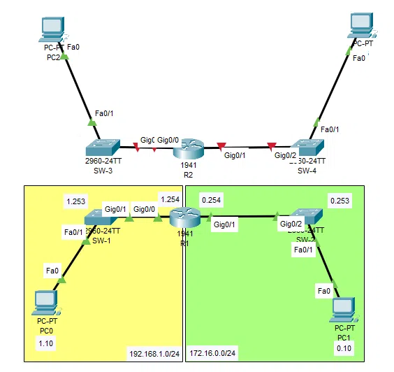 Nommez comme moi le second routeur R2, le switch en haut à gauche SW-3 et celui en haut à droite SW-4. Configurez les appareils de manière correcte en n'omettant aucun élément d'une configuration basique.