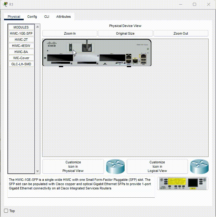 Sur Packet Tracer, il est possible de gérer les slots d'extension des appareils. Si vous cliquez sur le routeur R1 puis sur l'onglet Physical, vous verrez apparaître à gauche une liste à côté de la photo de l'arrière du périphérique. C'est la liste des extensions disponibles.