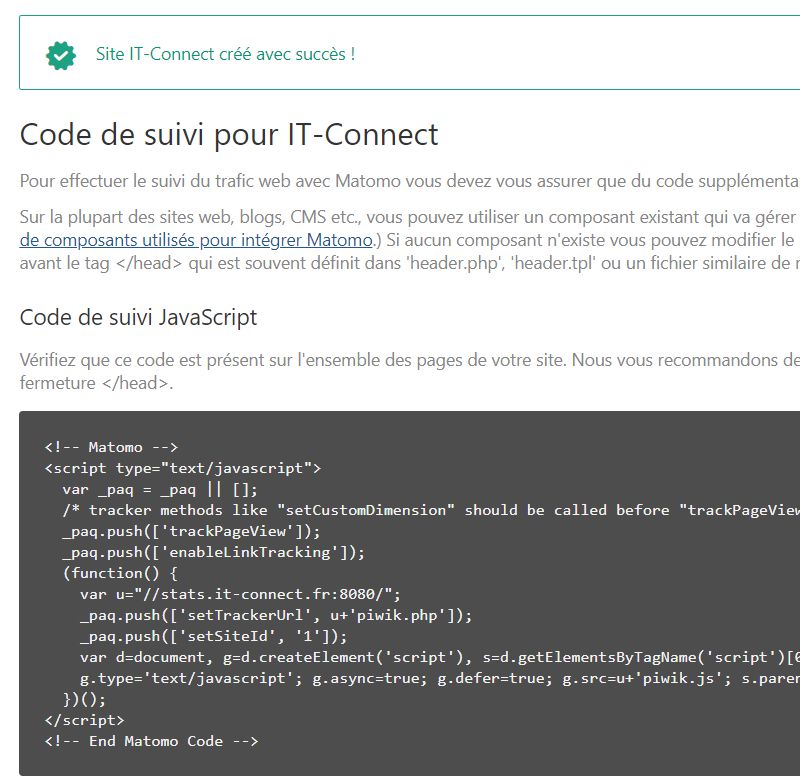 Suite à cet enregistrement, Matomo vous indique le code de suivi qu’il faudra charger sur les pages de votre site pour mesurer l’audience ! Il est recommandé d’intégrer ce code dans l’en-tête HTML de vos pages, c’est-à-dire avant la fermeture de la balise ‘<head>’.