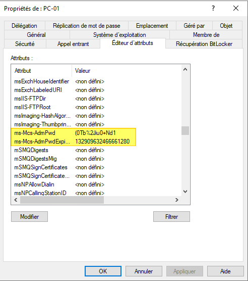 Rendez-vous dans l'onglet "Editeur d'attributs" et là vous devriez voir les deux valeurs : le mot de passe et la date d'expiration. Cela signifie que pour se connecter avec le compte "Administrateur" sur la machine "PC-01", il faut utiliser le mot de passe qui s'affiche au sein de l'attribut "ms-Mcs-AdmPwd".