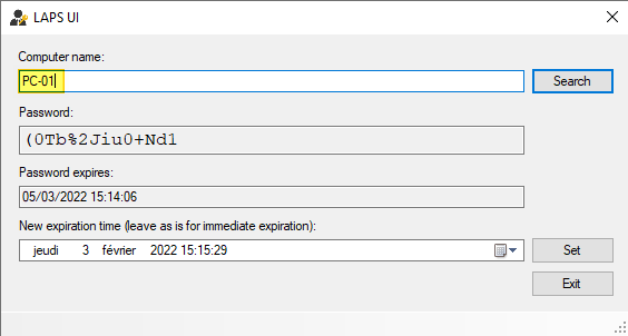 A partir du menu Démarrer de votre serveur, vous pouvez trouver l'application "LAPS UI" à l'intérieur d'un dossier nommé "LAPS". Ce petit utilitaire est très pratique et va éviter d'utiliser la console Active Directory. Il va permettre d'afficher le mot de passe et la date d'expiration d'un ordinateur.