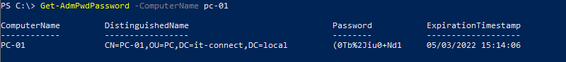 Passons à la troisième et dernière méthode : PowerShell. Le module LAPS intègre un cmdlet qui va faire notre bonheur : Get-AdmPwdPassword. Il suffit de préciser le nom de l'ordinateur cible, par exemple "PC-01" :